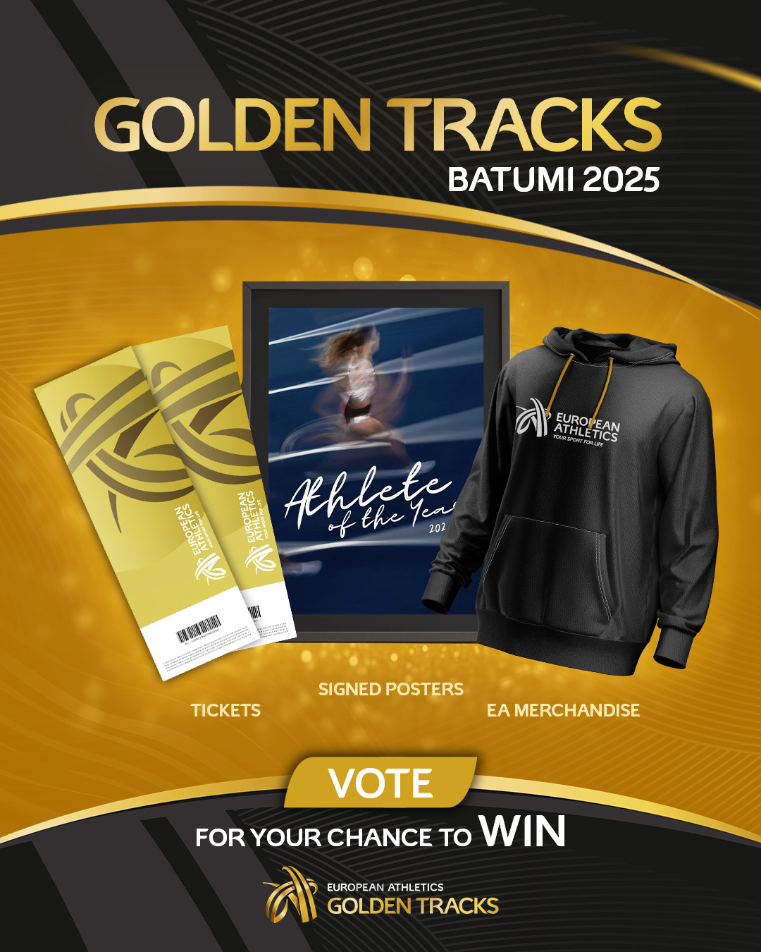Sign up to cast your vote on the dedicated European Athlete of the Year voting platform here and you will also be in with a chance of winning prizes* including tickets to a European Athletics event in 2026, posters signed by an athlete attending the Golden Tracks awards and European Athletics merchandise!