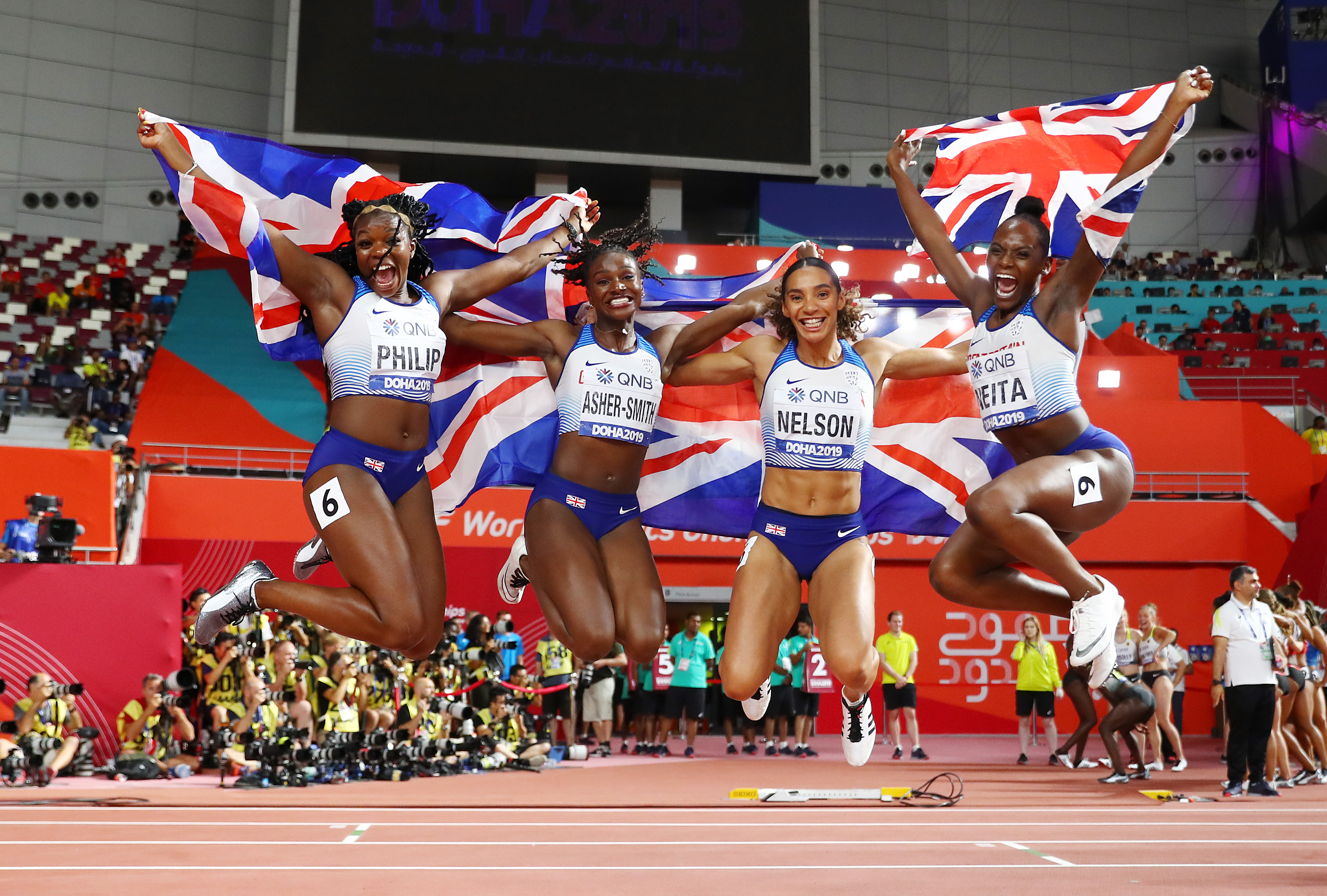 [From left to right: Asha Philip, Dina Asher-Smith, Ashleigh Nelson, Daryl Neita]